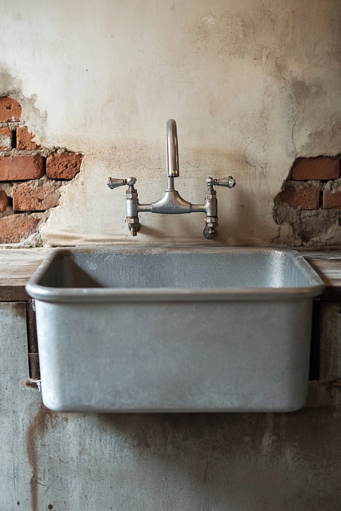 Add vintage or industrial-style faucets with distinctive handles. Use open shelving or wall-mounted racks for cleaning tools, brushes, or decor.