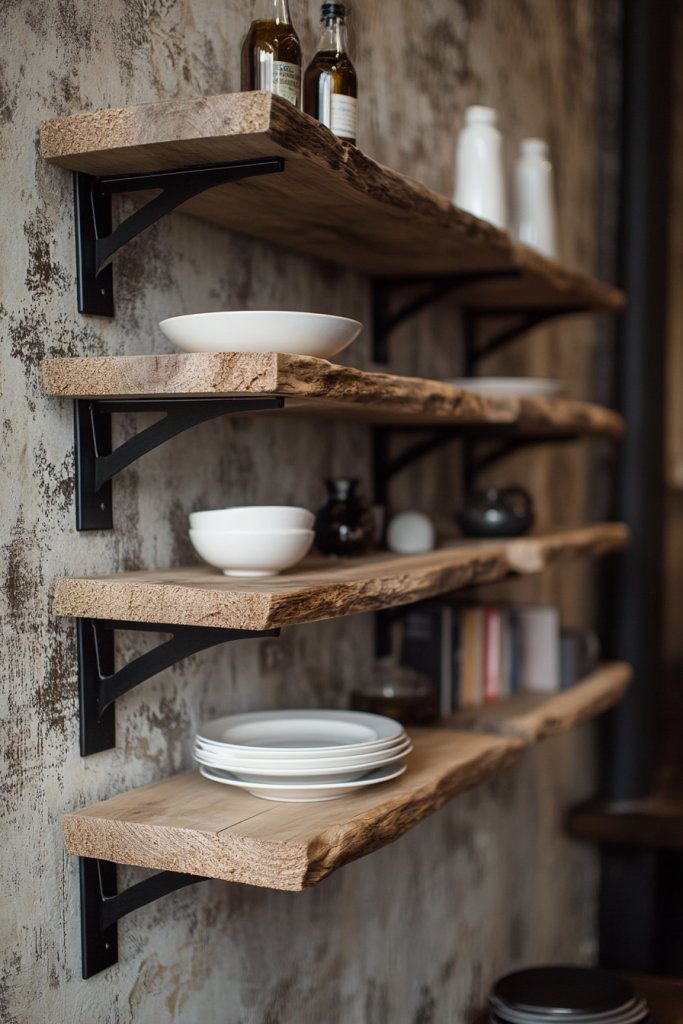 These shelves become a showcase of your taste and craftsmanship, adding depth to your kitchen. Raw edge shelves combine natural beauty with industrial strength, making your space feel both warm and rugged.