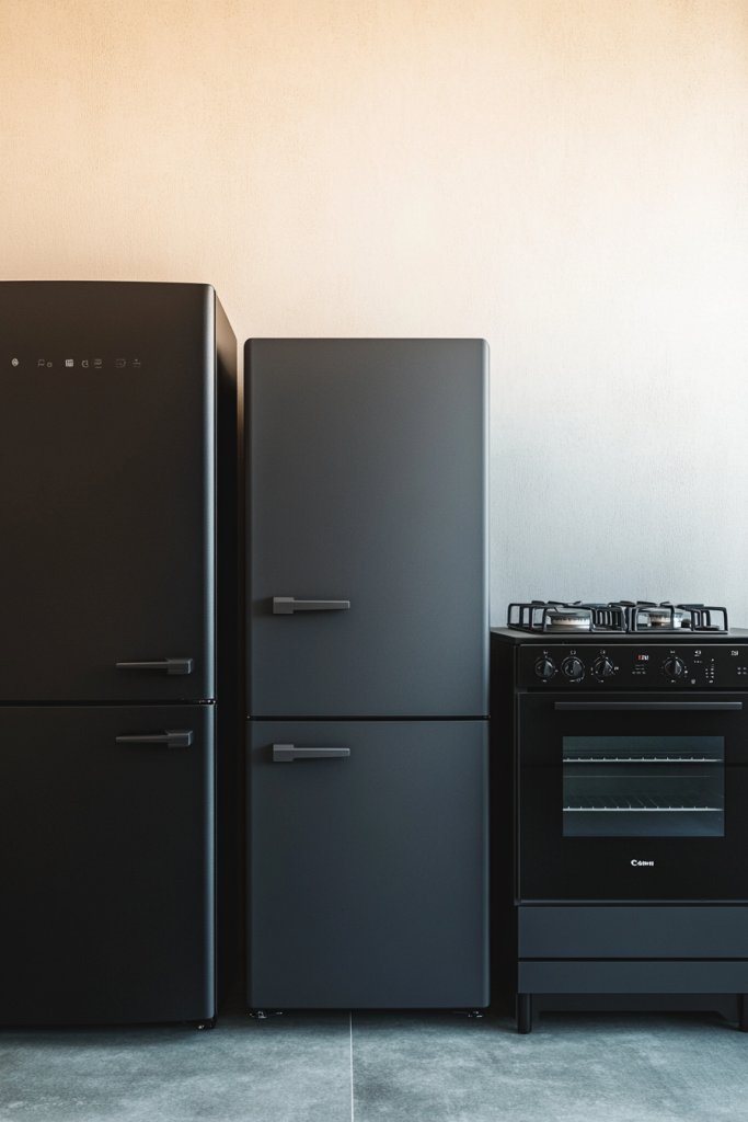 They’re practical too, hiding fingerprints and smudges better than shiny surfaces, making cleanup a breeze. Visualize a sleek, matte black refrigerator, oven, and microwave lined up with other dark fixtures and concrete countertops.