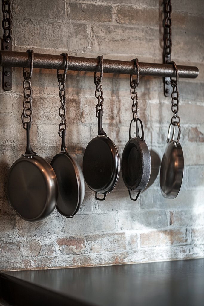 Counter or cabinet space is precious, and cluttered countertops can make your kitchen feel cramped. Hanging pot racks with sturdy metal chains solve this by providing accessible storage while adding an industrial flair.