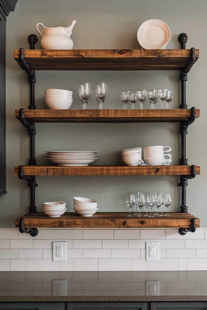 For a softer look, opt for painted wood shelves or add decorative brackets. Adjust shelf heights based on your storage needs — taller for larger pots or shorter for glassware.