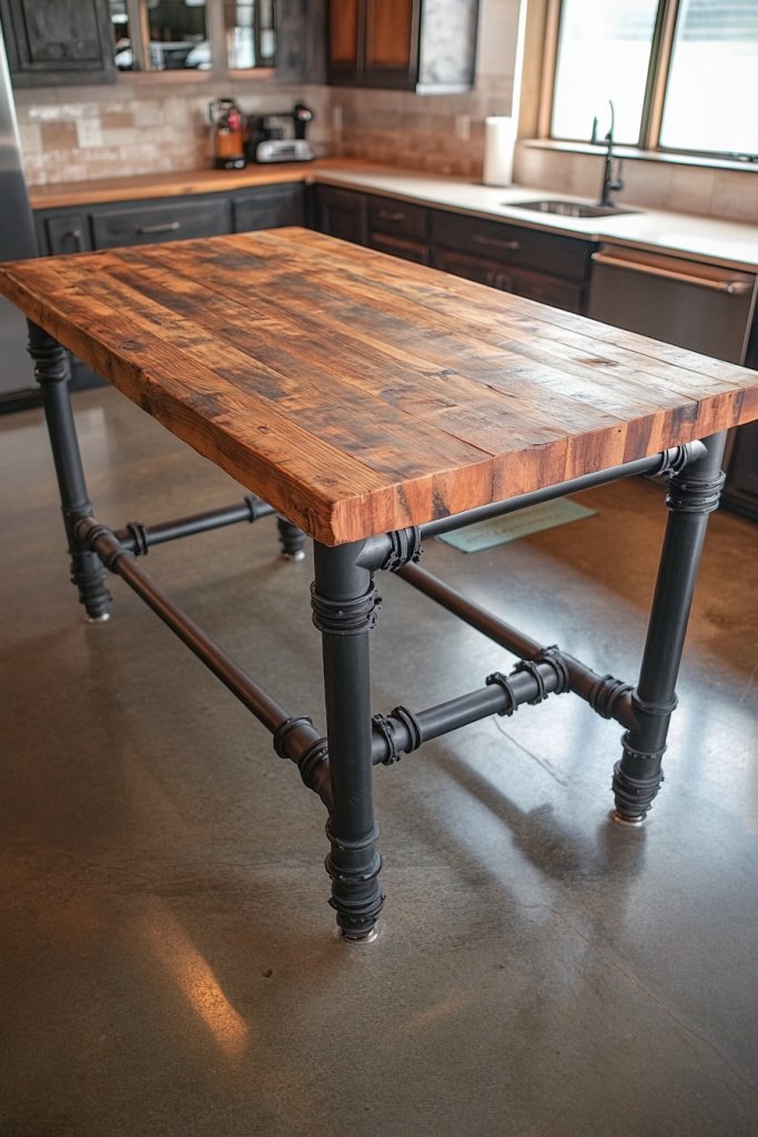 A kitchen island is often the heart of the space, but standard designs can feel boring or disconnected from an industrial vibe. A pipe-frame island adds a sturdy, utilitarian look that’s both functional and visually striking.