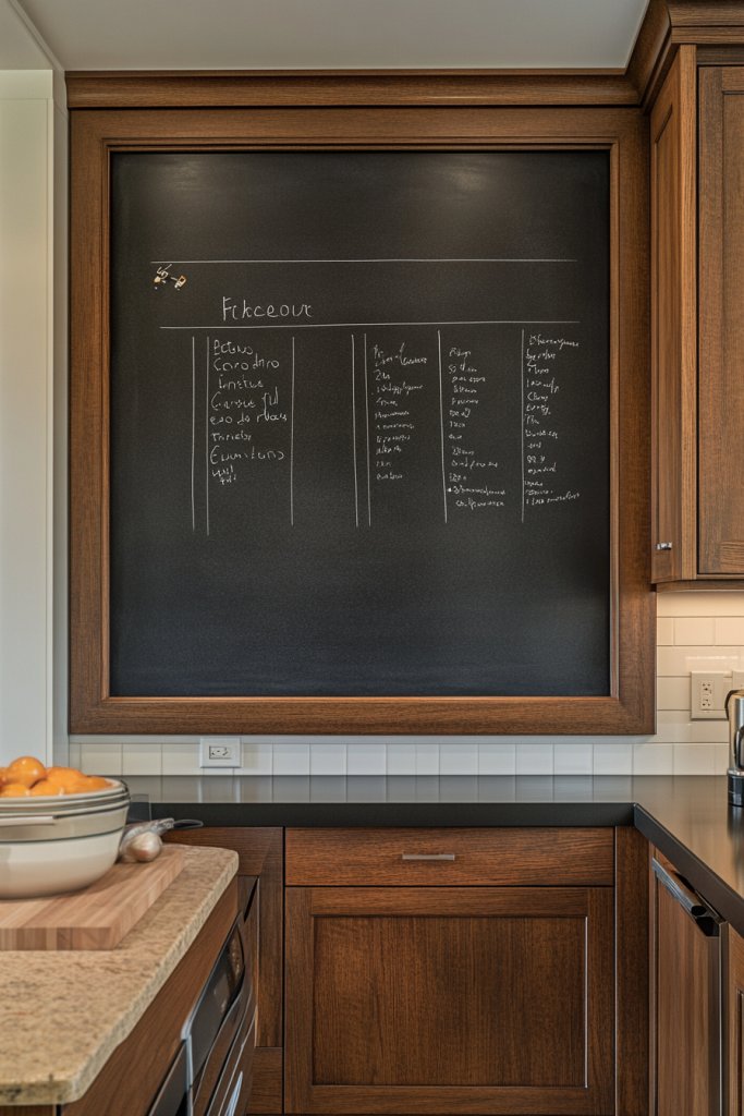 Imagine a large chalkboard painted on a blank wall or a magnetic panel with colorful magnets and notes. Picture handwritten reminders, grocery lists, or even kids’ artwork displayed proudly. The surface adds a rustic or modern vibe, depending on your choice of frame and finish. It’s both functional and decorative, making your kitchen more interactive.
