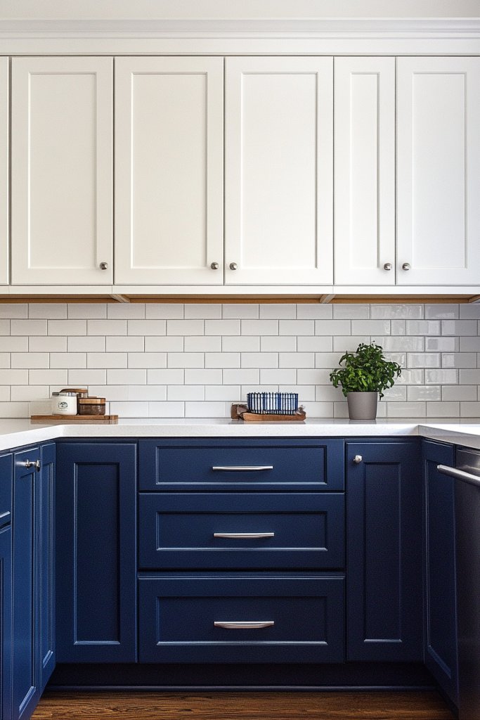 Imagine upper cabinets painted a soft dove grey while the lower cabinets pop in bold navy or deep green. The contrast draws your eye around the space and highlights different architectural features. Visualize how this layering creates a sense of dimension and richness. The interplay of colors adds personality and depth to an otherwise plain setup.