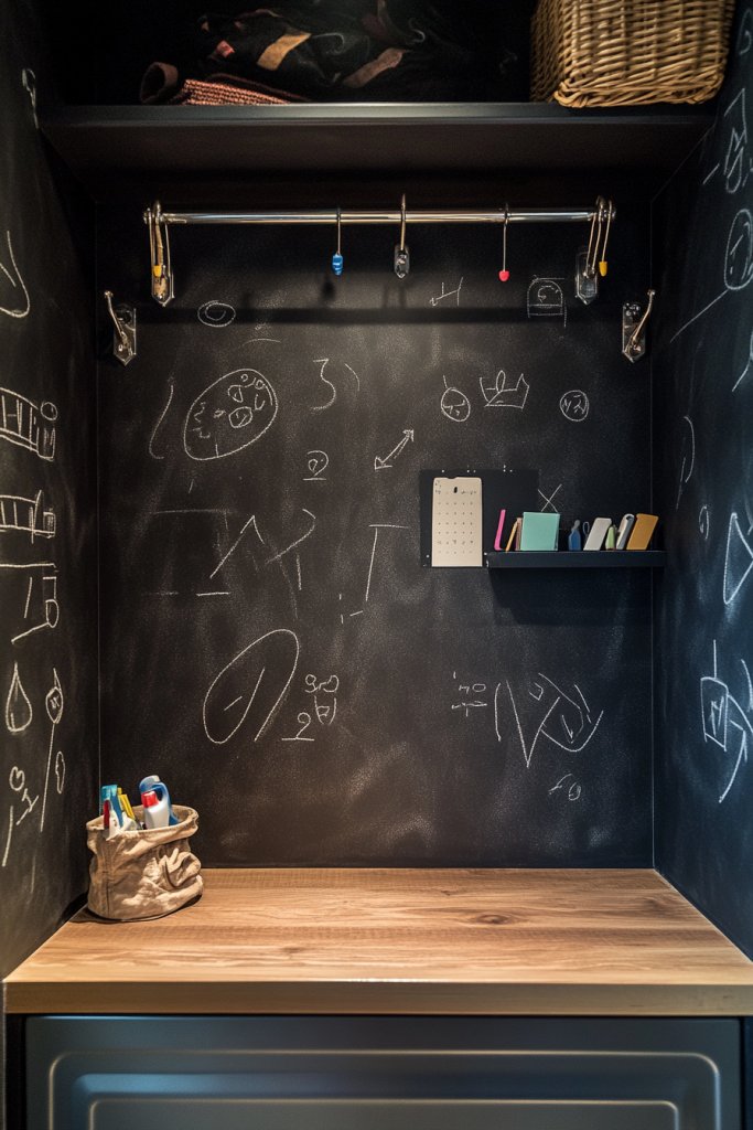 Personalize with colorful chalks, cute doodles, or custom labels for laundry zones. Add small decorative hooks or clips for hanging notes or keys. Incorporate a small decorative tray or container for chalk and erasers. These small details turn a functional wall into a charming, organized feature.
