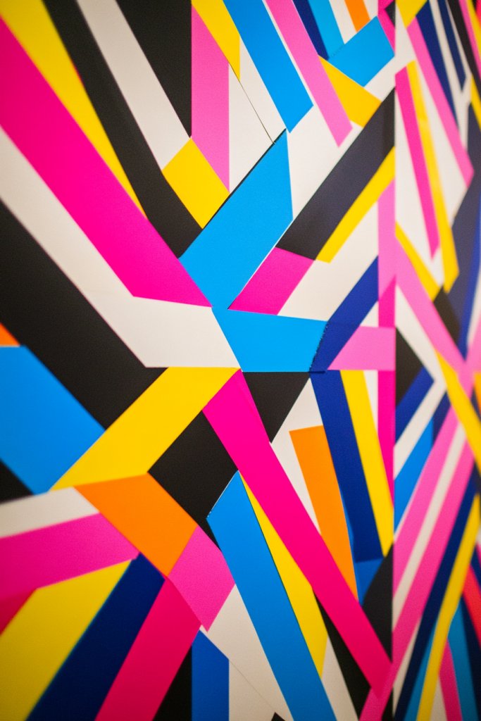 Visualize sharp, crisp lines forming triangles, chevrons, or abstract shapes across your wall, all created with painter’s tape. Bright, contrasting colors peek through, giving a vibrant, energetic vibe. The tape’s clean edges create a sense of order and precision, transforming a blank wall into a gallery of geometric patterns.