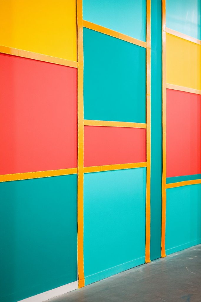 Visualize a wall divided into large, bold sections of contrasting colors, separated sharply by painter’s tape. The colors can be vibrant hues like turquoise and coral or muted pastels for a softer vibe. The clean lines and large color blocks make the space feel modern and lively. It’s a fresh, playful backdrop that can highlight furniture or decor.
