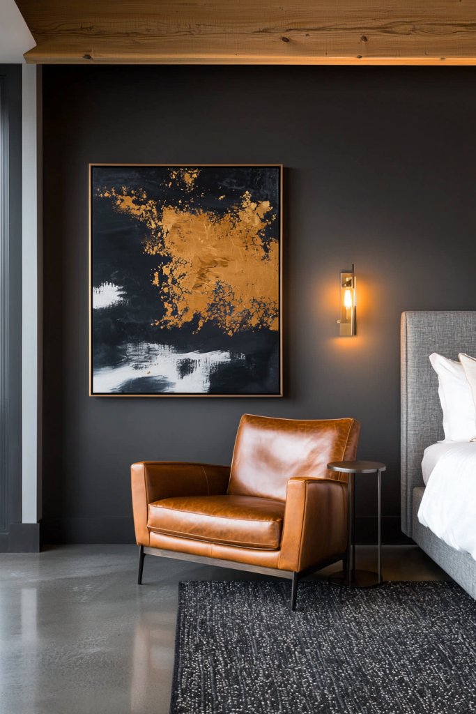 Large-scale abstract paintings in deep hues can add intensity, while black-and-white photography of urban landscapes brings a modern edge. You might also consider sculptures or metal wall art that adds texture and dimension.