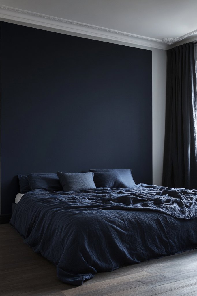 Imagine a deep navy or rich charcoal wall behind your bed, creating a striking focal point. The matte finish absorbs light softly, adding depth and elegance. The wall’s dark hue contrasts beautifully with crisp white linens or warm-toned bedding. Textured throws and plush pillows pop against this backdrop, making the space feel cozy yet modern. The overall effect is a room that feels curated and intentional.