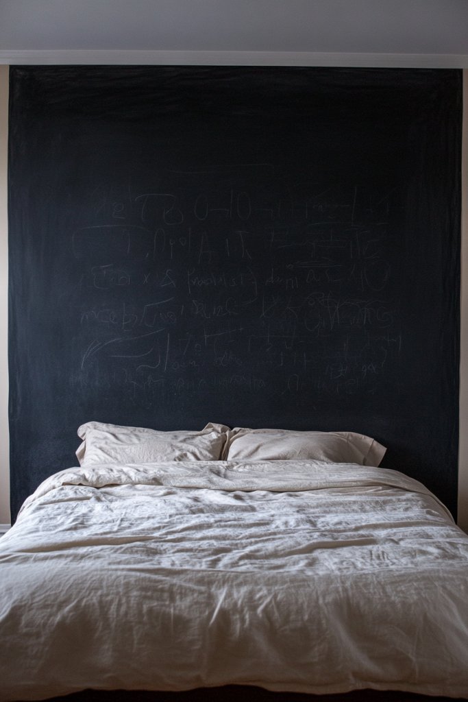 Picture a large, matte black wall behind your bed, ready to serve as a canvas. Write motivational quotes or sketch simple designs with colorful chalks, adding a playful touch. The matte finish absorbs light and reduces glare, making writing easy. When decorated with framed photos or textured bedding, the chalkboard wall becomes both functional and artistic. It invites interaction, making your bedroom a space of expression.