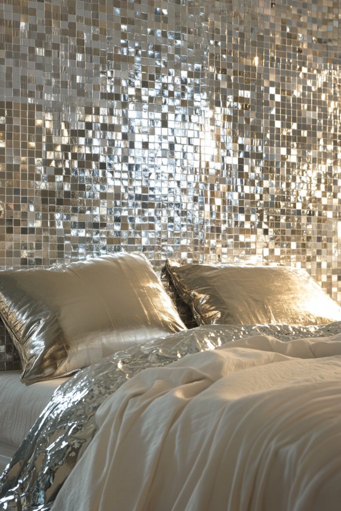 Decorate the surrounding area with simple, sleek accessories or textured textiles that play with reflective surfaces. Incorporate lighting fixtures like LED strips or spotlights to enhance the shimmer. Use metallic or glass decor elements to echo the tiles’ shine. Personal touches include framed art or decorative objects that complement the luxe theme. This wall becomes a statement piece that elevates your entire bedroom aesthetic.