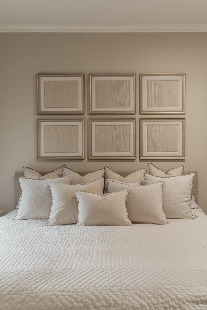 Decorate the framed panels with complementary textiles or small decorative objects on nearby shelves. Incorporate accent lighting to highlight textures and frames. Use throws, pillows, or bedding in shades that harmonize with the neutral tones. Personal touches like monogrammed accents or custom framing can make the arrangement uniquely yours. It’s a delicate, elegant feature that elevates your bedroom’s ambiance.