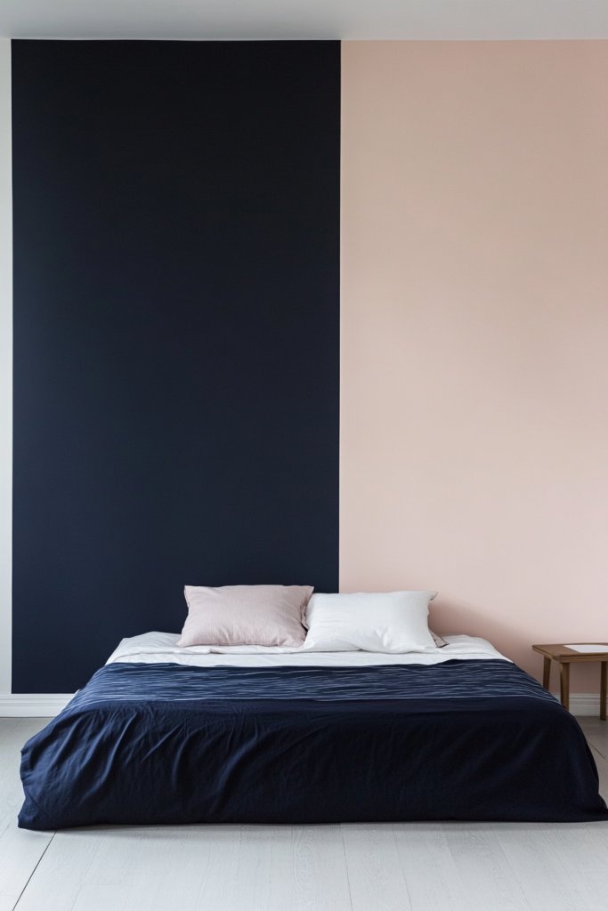 Picture a wall divided into large, crisp blocks of color—perhaps navy and blush, or emerald and blush—creating a graphic, contemporary look. The clean lines and sharp contrasts make the space feel fresh and energetic. When paired with neutral bedding and sleek furniture, it becomes a focal point that commands attention without feeling busy. The bold color blocks add rhythm and structure, making your room look thoughtfully designed.