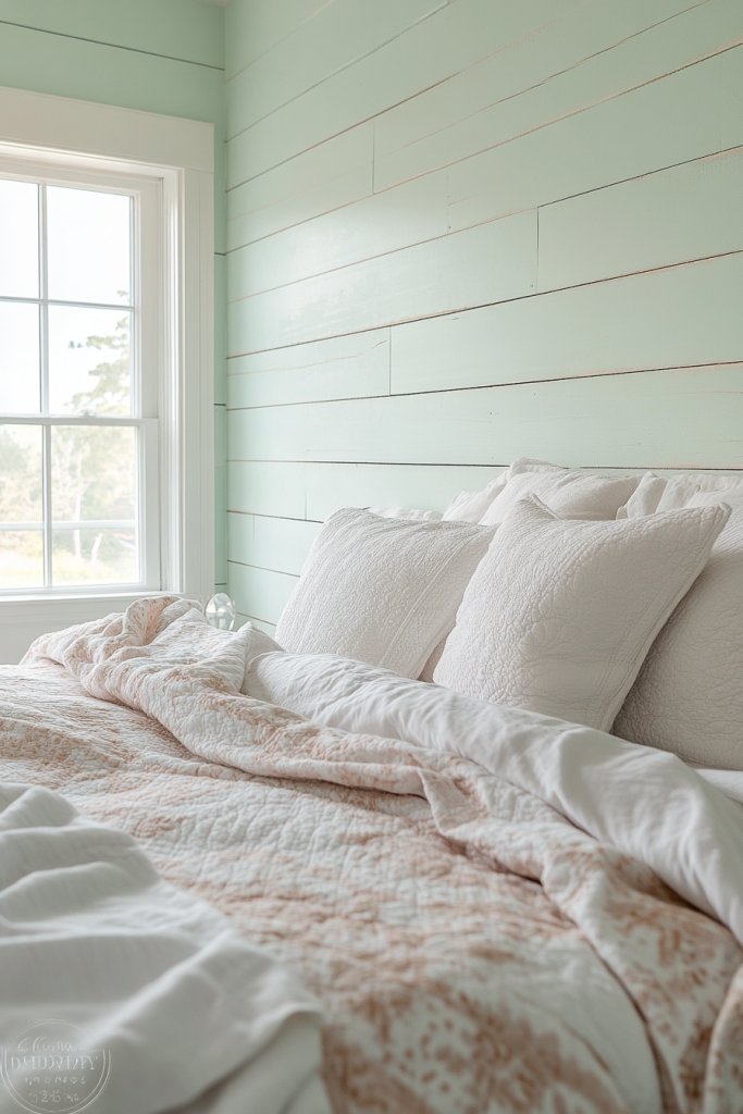 Decorate the shiplap wall with framed photos, decorative mirrors, or subtle wall-mounted lighting. Use textiles like cozy bedding, layered rugs, and curtains that complement the soft palette. Incorporate nautical or farmhouse elements through accessories or decorative objects. Personal touches turn the wall into a warm, inviting focal point. It’s a versatile backdrop that suits many decor styles.