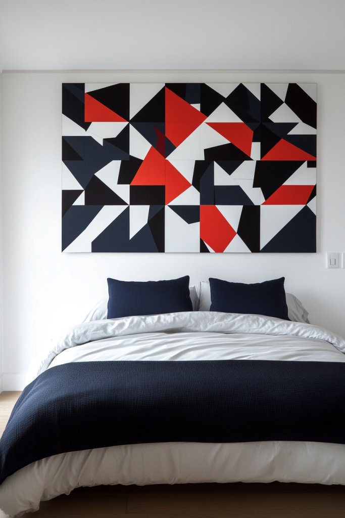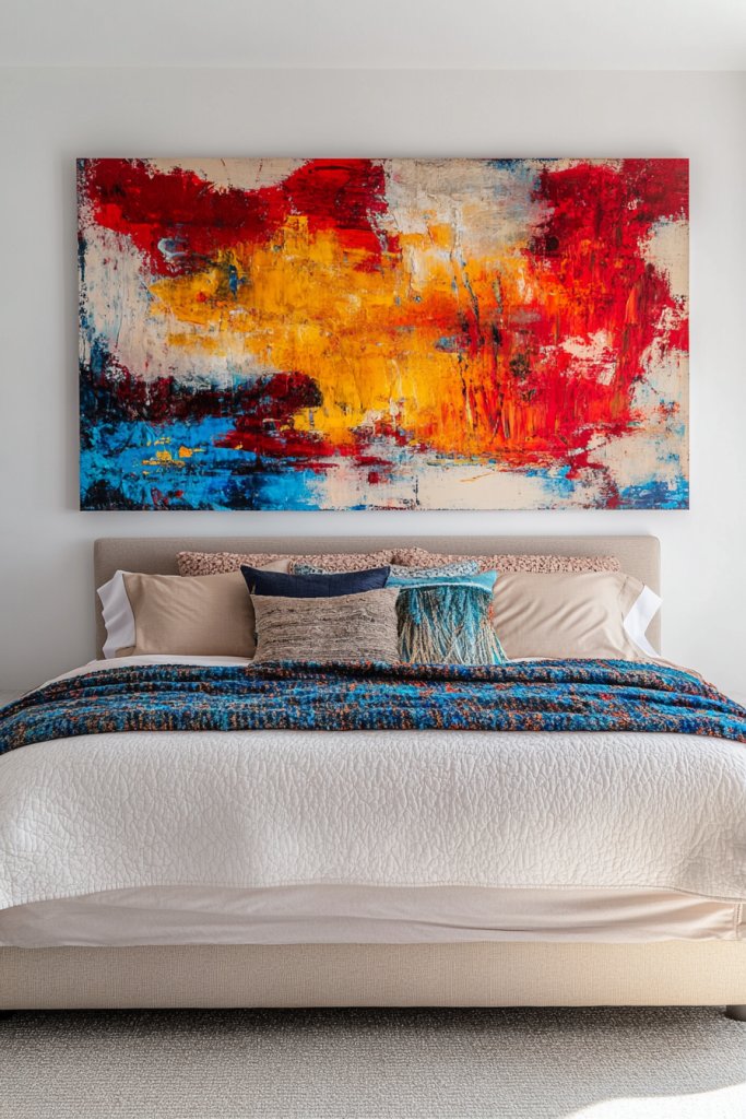 Picture a large canvas or decal with sweeping brushstrokes or geometric splashes in vibrant reds, blues, and yellows. The bold colors and dynamic shapes create movement and excitement, drawing the eye immediately. When paired with minimalist furniture and neutral bedding, the art becomes a striking statement piece. The textured or layered effect adds depth, making the wall a true focal point. It’s a visual burst of creativity in an otherwise calm room.