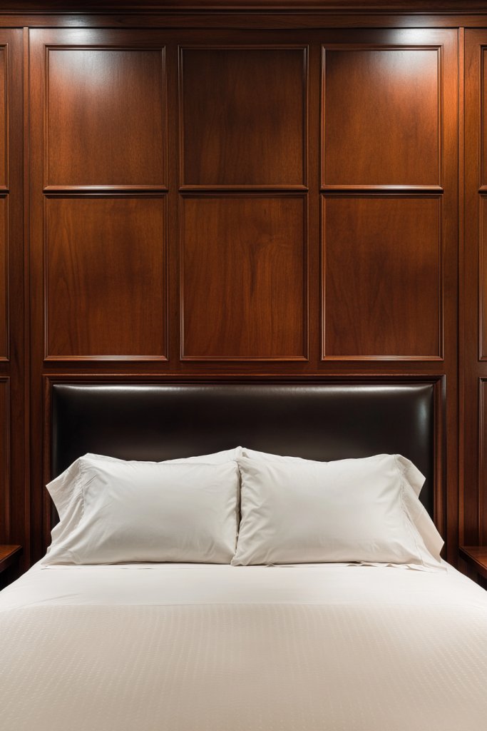 Imagine a wall clad in rich, dark wood or smooth, faux leather panels arranged in a grid or vertical strips. The natural grain or sleek surface adds a sense of depth and tactile appeal. The panels catch and reflect light differently depending on the finish—matte or gloss—creating a layered look. When paired with plush bedding and soft lighting, it creates a cozy, high-end ambiance that feels both modern and inviting. It’s like a piece of furniture that becomes a backdrop.