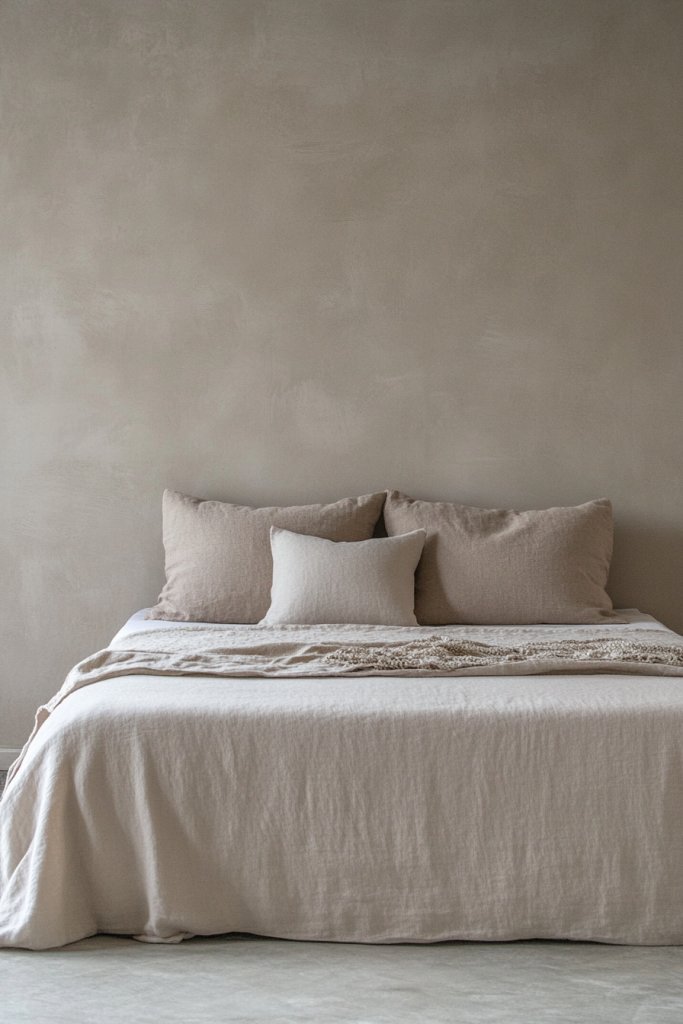 Visualize a wall with a soft, plastered finish in shades of beige or taupe, featuring natural variations and gentle undulations. The textured surface catches light differently throughout the day, creating a peaceful play of shadows. When paired with plush bedding and minimalist furnishings, it exudes understated luxury. The layered effect adds richness and a handcrafted touch, making your space feel warm and inviting.