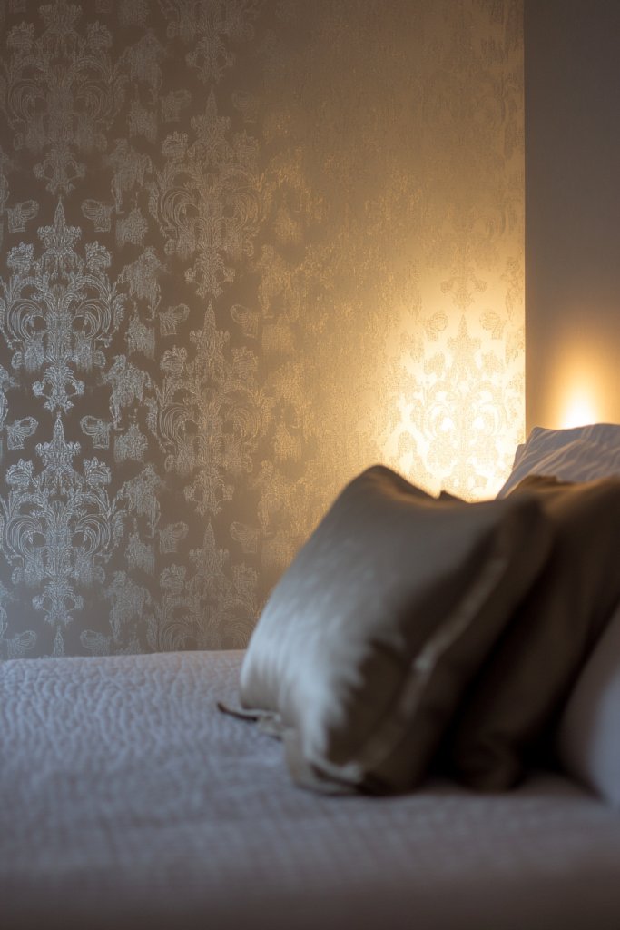 Envision a wallpaper with a delicate damask pattern shimmering softly in gold or silver. The metallic threads catch the light at different angles, creating a dynamic, ever-changing visual. The background remains neutral or muted, ensuring the pattern enhances rather than dominates. When paired with plush bedding and soft lighting, the room exudes sophistication and calm. Textured wallpaper adds depth, making the walls feel layered and plush to the touch.