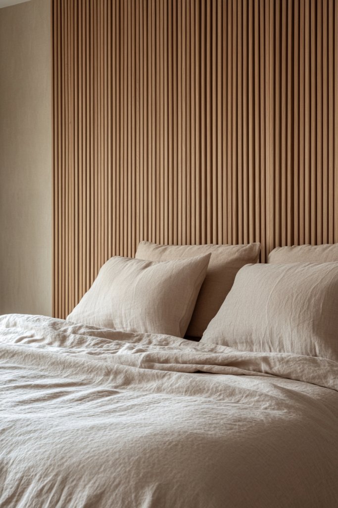 Picture horizontal or vertical wooden slats covering a large wall behind your bed. The warm tones of natural wood—oak, walnut, or pine—contrast beautifully with cool-toned bedding or neutral walls. The slats create a rhythmic pattern that guides your eye across the room, adding a sense of movement and structure. When lit softly, the wood’s grain and texture come alive, making your bedroom feel like a boutique hotel suite.