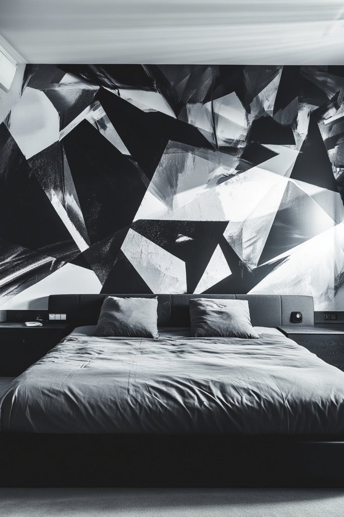 Picture a large-scale mural in shades of gray or black and white stretching across your wall. The abstract shapes or subtle patterns evoke a sense of artistry and sophistication. The monochrome palette ensures the mural complements your existing decor without clashing. When paired with sleek furniture and neutral bedding, it anchors the room with a powerful visual presence. The mural’s scale and tonal variations draw the eye and add depth.