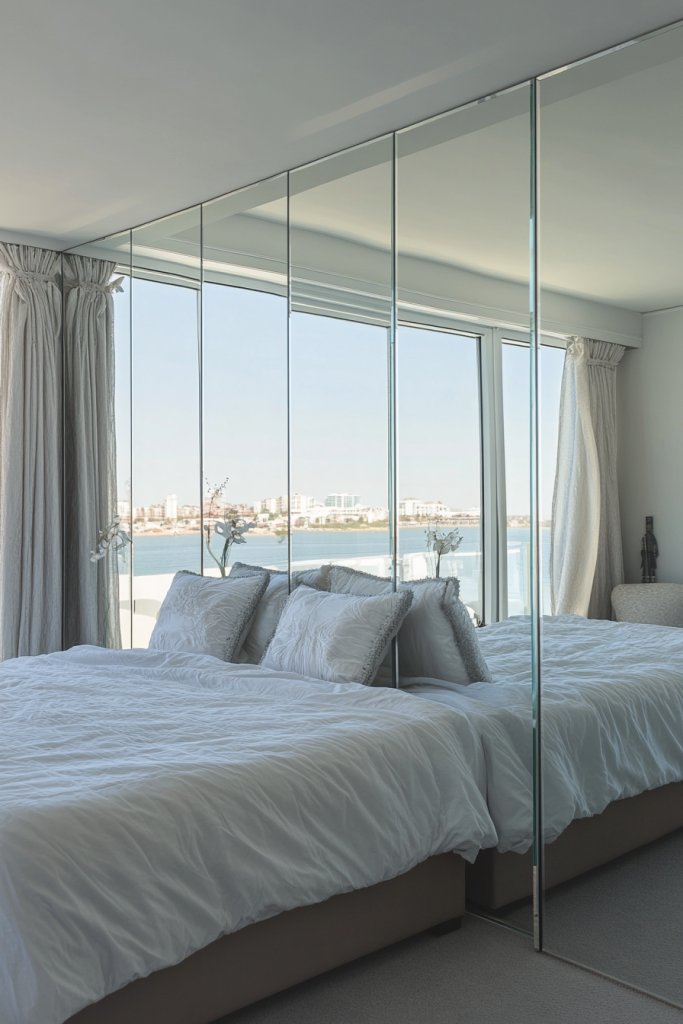 Complement the mirrored wall with sleek metallic or glass accessories. Incorporate ambient lighting or spotlights to enhance reflections and add warmth. Use decorative textiles like plush bedding or textured rugs to soften the overall look. Personalize with framed photos or art nearby that won’t compete with the mirror’s sleekness. The result is a luminous, spacious bedroom that feels luxurious and inviting.
