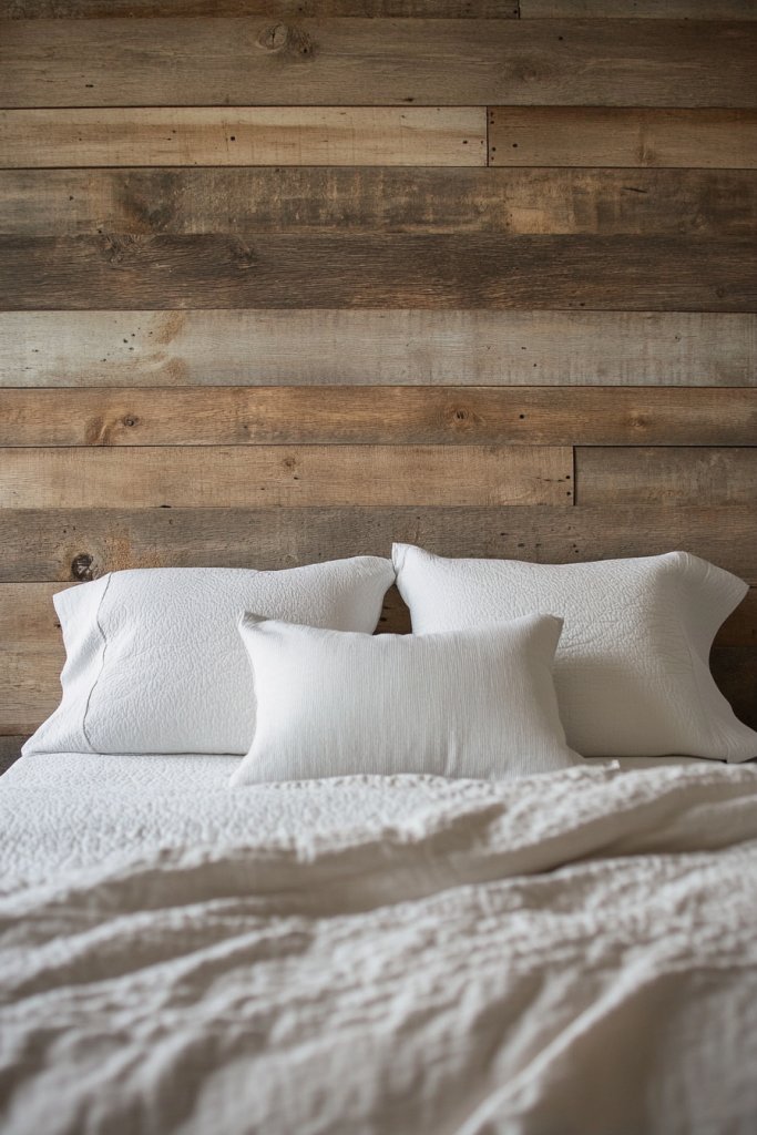 Decorate the reclaimed wood feature with vintage accessories or metallic accents nearby. Incorporate textured bedding and layered textiles to complement the rustic theme. Use warm lighting like Edison bulbs or hidden LEDs to highlight the wood’s grain. Personalize further with framed vintage photos or decorative metalwork that enhances the rustic charm. This feature makes your bedroom feel rooted, warm, and inviting.
