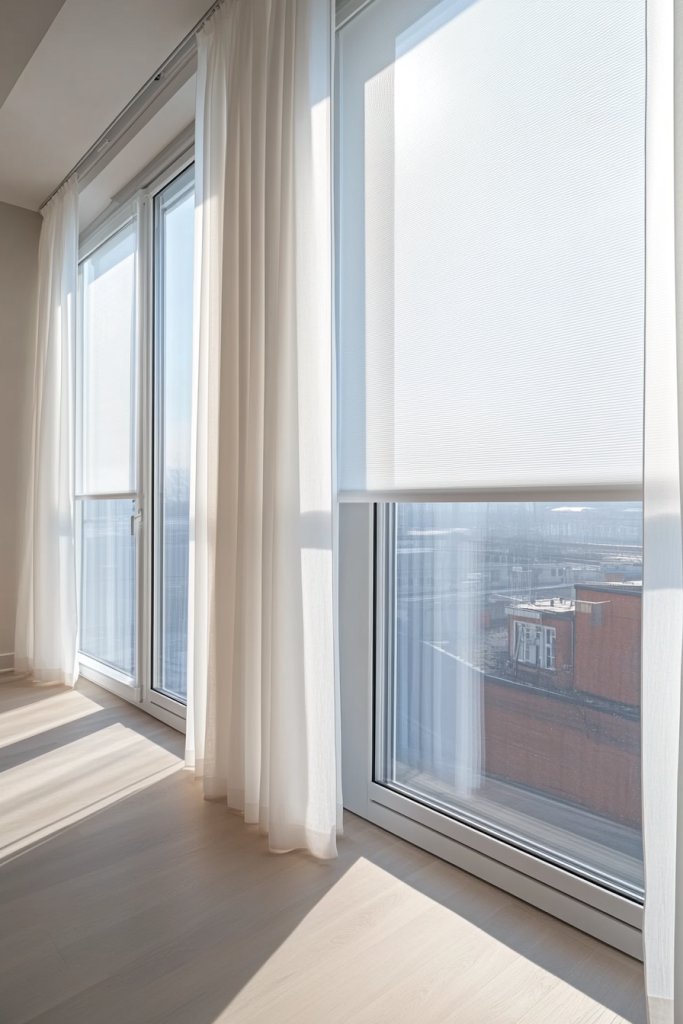 Picture sleek roller shades in a neutral tone, fitting seamlessly into the window frame. They roll up completely during the day, revealing the view and flooding the room with sunlight. When lowered, they provide privacy without adding visual clutter. The streamlined look makes your windows a subtle, stylish feature rather than a focal point.