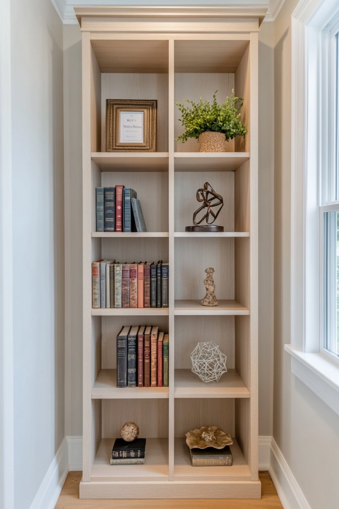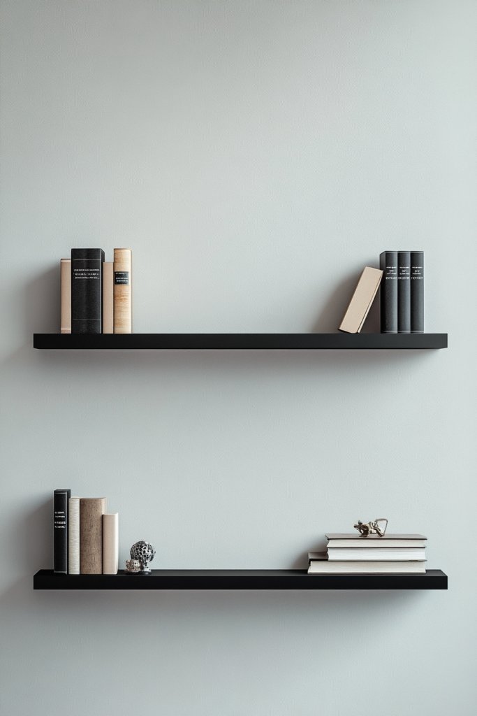 Picture floating shelves in a soft matte finish, holding a curated collection of books, candles, or ceramics. The clean lines draw the eye upward, making the room feel taller and more open. Minimalist brackets or hidden mounting systems keep the look seamless. These shelves create a gallery-like effect, emphasizing quality over quantity.