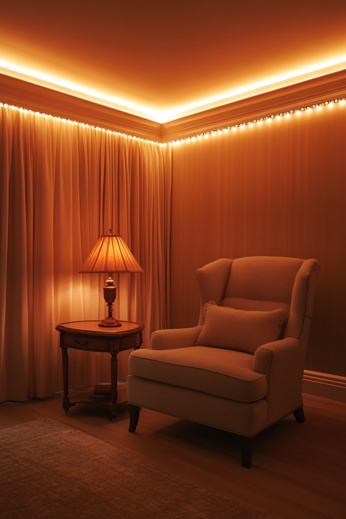 Picture warm LED strips tucked behind crown molding or under floating shelves, casting a gentle glow. Table lamps with soft fabric shades or wall sconces provide localized, warm pools of light. The overall effect is a layered lighting setup that feels warm and inviting, emphasizing cleanliness and simplicity. It’s cozy without clutter.