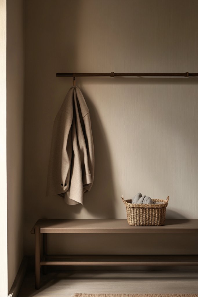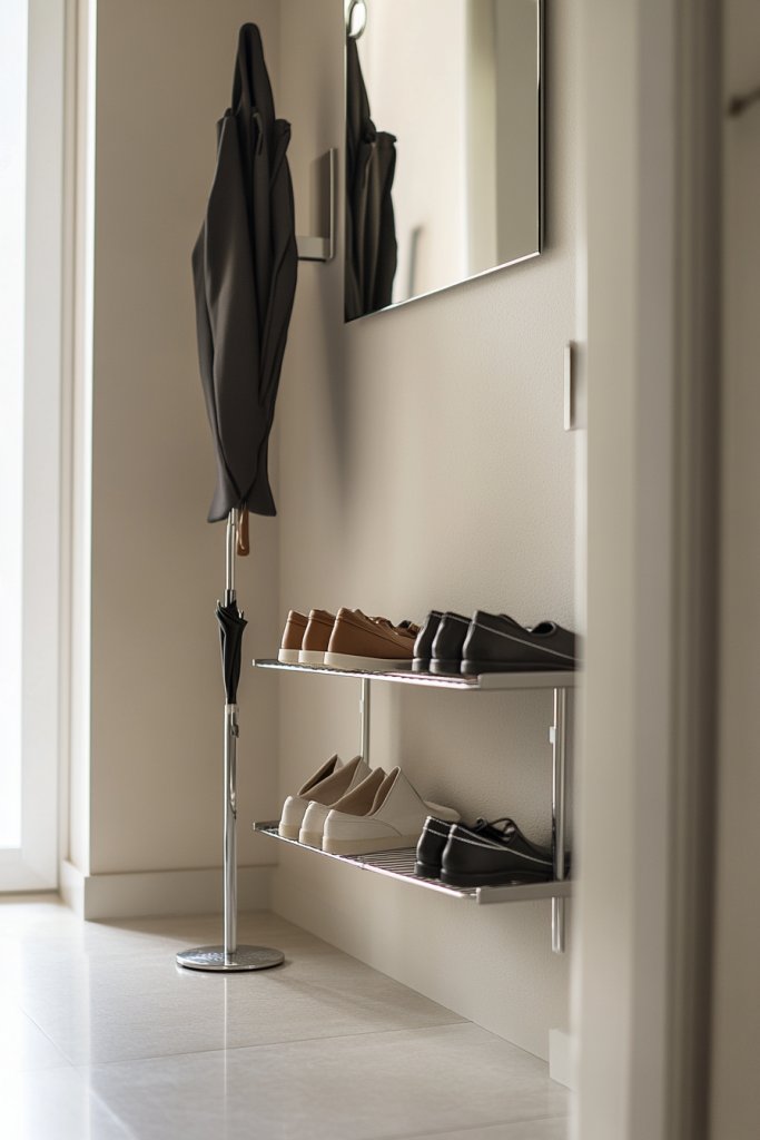 Visualize a narrow wall-mounted rack with sleek hooks and a slim shelf above for keys and sunglasses. Shoes are stored neatly in a compact shoe rack or cubbies underneath. The space remains open, inviting, and functional. Minimalist design ensures the entryway feels calm and welcoming rather than cluttered.