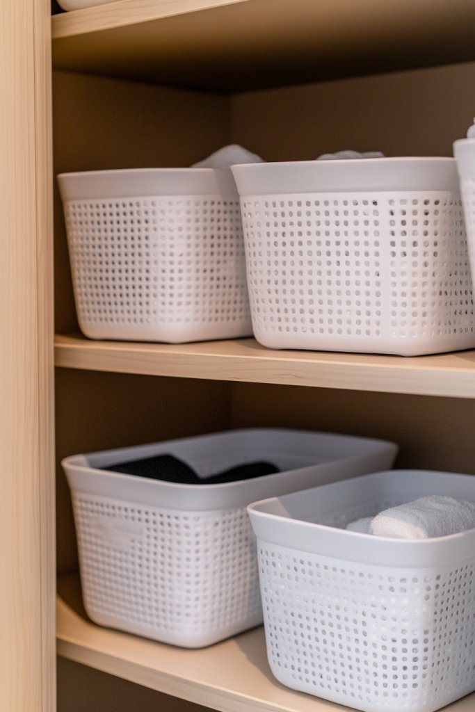 Use baskets or boxes in various sizes to accommodate different items, from small toiletries to larger household tools. Opt for materials like woven wicker, fabric-lined cardboard, or sleek plastic for different aesthetics. Incorporate clear lids or open designs based on accessibility needs. Match or contrast with your decor for a unified look.