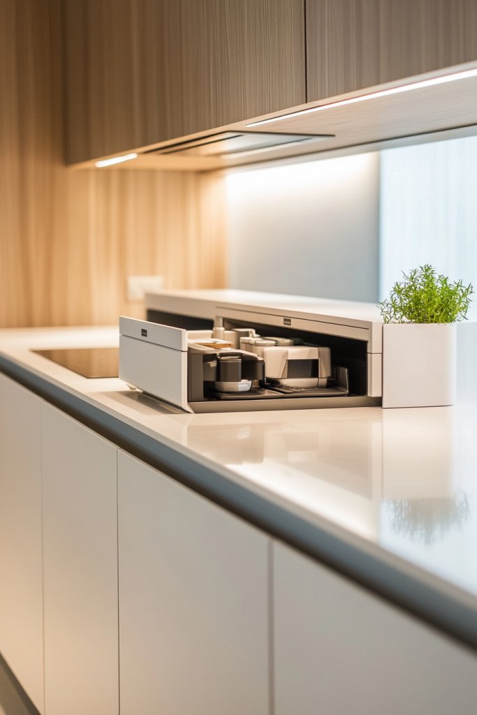 Picture a pristine kitchen with a smooth, uninterrupted countertop—no toaster, blender, or coffee maker in sight. Instead, these appliances are tucked into custom cabinets or built-in drawers, with only the cords and minimal accessories visible. The space feels open and orderly, making meal prep more enjoyable. It’s a clean canvas ready for creativity.