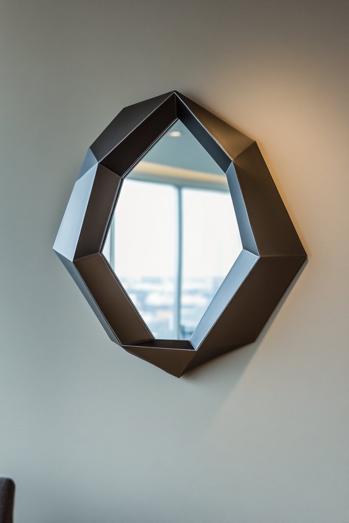 Envision a uniquely shaped mirror, perhaps triangular or polygonal, fitting snugly into a corner. Its reflective surface amplifies light and creates a sense of depth. The angular shape contrasts with soft furnishings, adding a contemporary edge. Reflections bounce around, making your space feel larger and more dynamic.