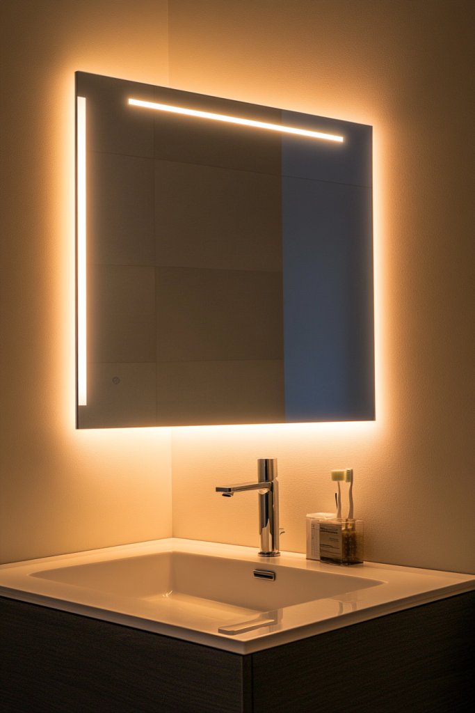 Visualize a large mirror framed with a slim, minimalist border, with soft LED lights casting a gentle glow behind it. The backlighting creates a floating effect, highlighting the mirror’s shape and adding depth. When turned on, the glow enhances your space with warm or cool tones, depending on your mood. It’s like having a piece of art that also improves your lighting.