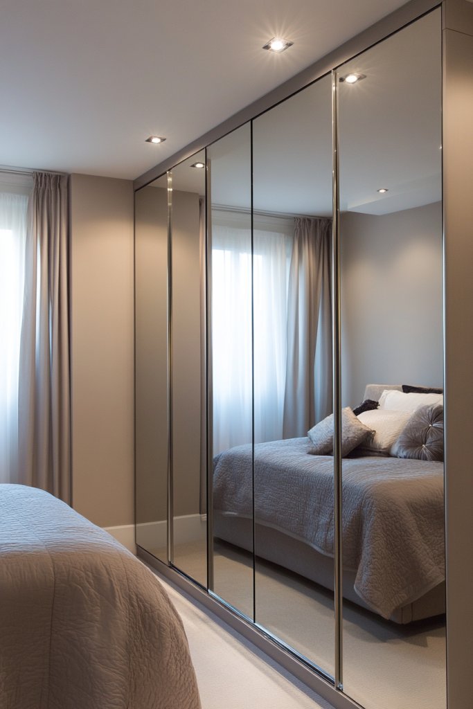 Imagine sliding doors that seamlessly blend into your room, reflecting your entire space with clarity. They double as a mirror for quick outfit checks and visually expand the room. When open, they reveal storage; when closed, they add a sleek, polished look. The reflective surface brightens the room by bouncing natural light around.