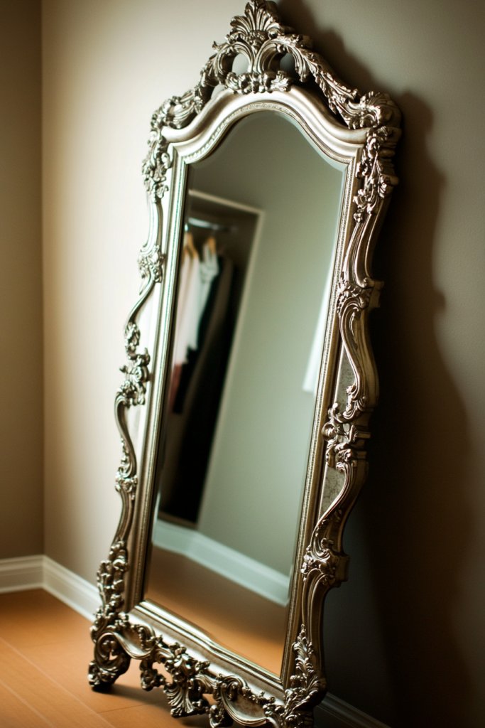 Select a high-quality, sturdy mirror with a decorative frame that fits your space. Place it on the floor or lean it against the wall, securing it if needed for safety. Ensure the mirror is at eye level and the frame complements your decor theme. Regularly dust and clean the glass for optimal reflection. Consider adding a decorative rug or pedestal for visual interest.