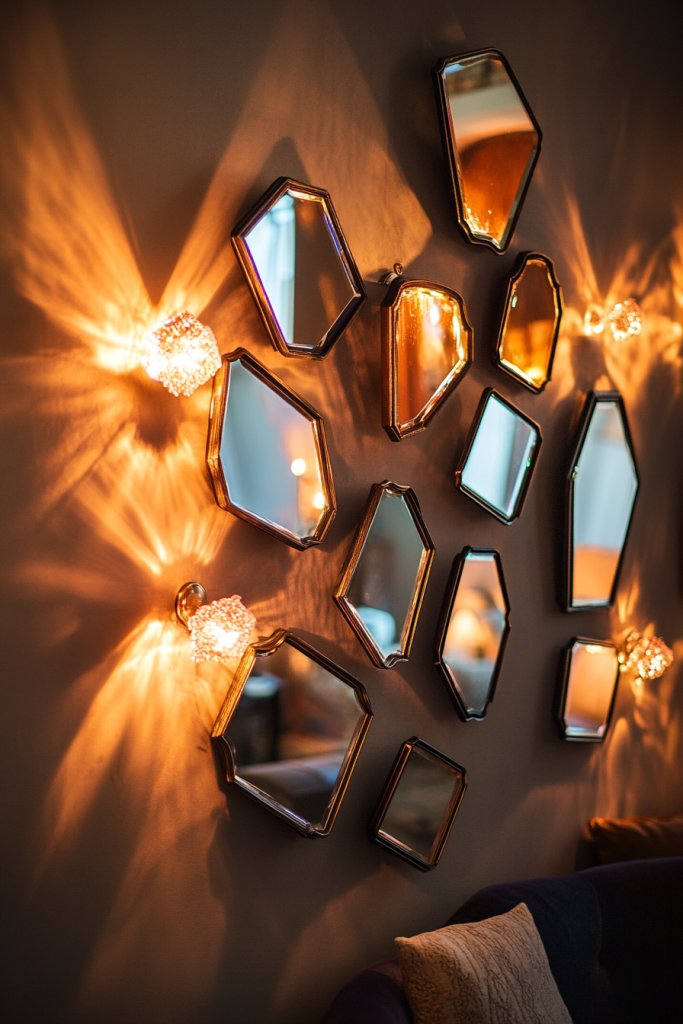 Imagine a grouping of small, varied mirrors arranged in an organic or geometric pattern on your wall. Accent lighting—such as picture lights or spotlights—illuminates the mirrors, casting interesting shadows and highlighting their shapes. The reflections multiply the light, making your room brighter and more dynamic. It’s like a mini art installation that also brightens your day.