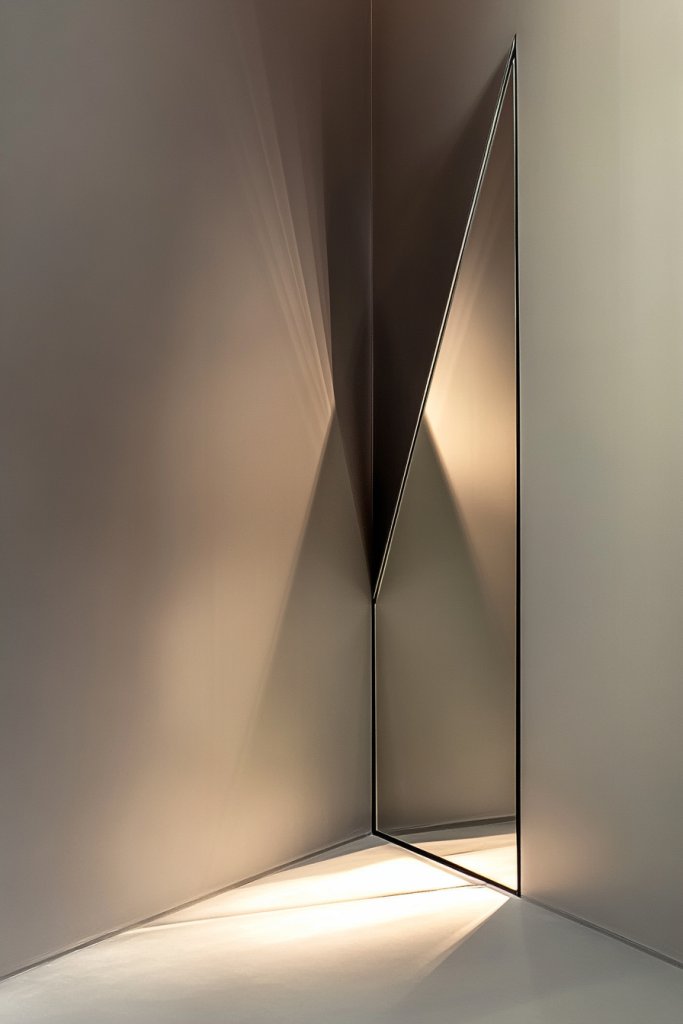 Looking to maximize corner spaces with a bold statement? A mirrored corner accent with an angular design transforms awkward angles into a sleek, modern feature. It’s perfect for small rooms or to add architectural interest. This idea introduces a striking focal point with minimal effort.