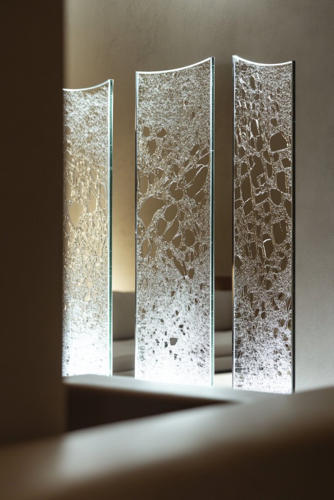Picture large panels featuring abstract etched patterns or frosted glass with textured overlays. The designs catch and scatter light, adding a layer of visual interest without overwhelming the space. The reflective surface enhances the artwork, creating a subtle interplay of patterns and reflections. It’s like a piece of modern art that also brightens your room.