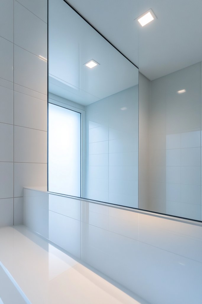 Imagine a large, seamless glass surface stretching across an entire wall, reflecting your room with clarity. The absence of a frame creates an illusion of depth, making even small rooms seem larger. The smooth, reflective surface catches natural daylight, brightening the space and creating a calming, spa-like atmosphere. It’s like having a giant window that doubles as art.