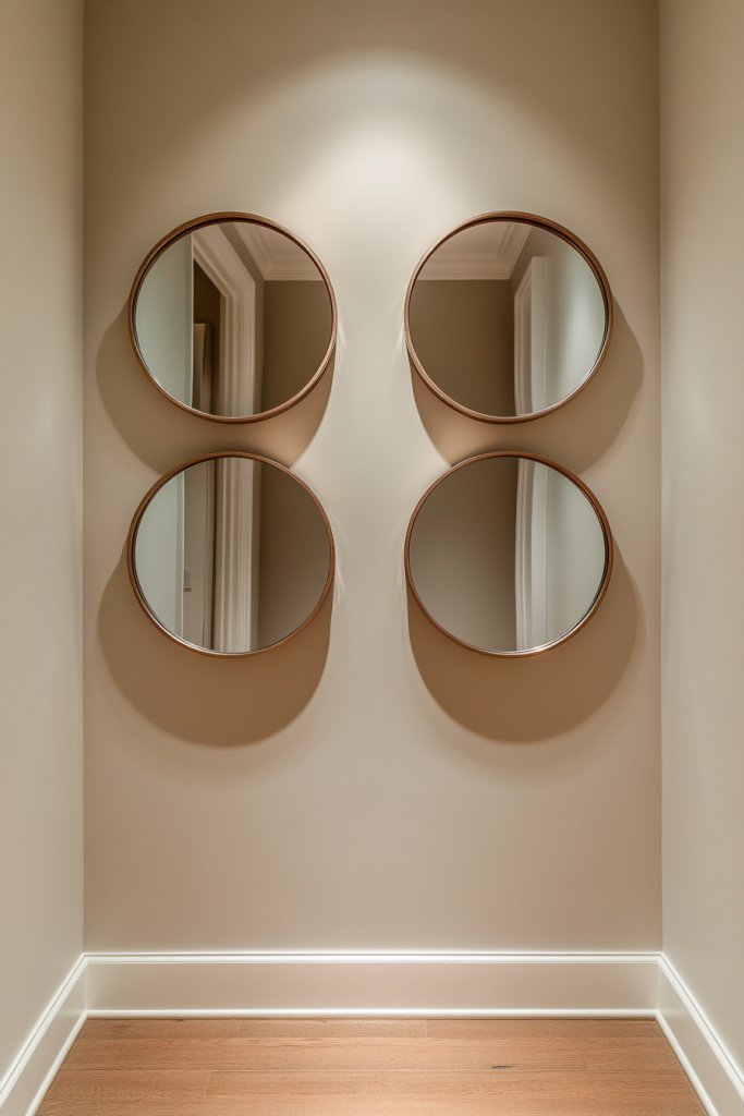 Imagine a grid of perfectly aligned round mirrors, each reflecting light and creating a rhythmic pattern across the wall. The uniformity brings a sense of balance, while the reflective surfaces add brightness. The repetition of shapes makes the room feel more structured and spacious. It’s like a visual symphony of circles that soothe and energize.