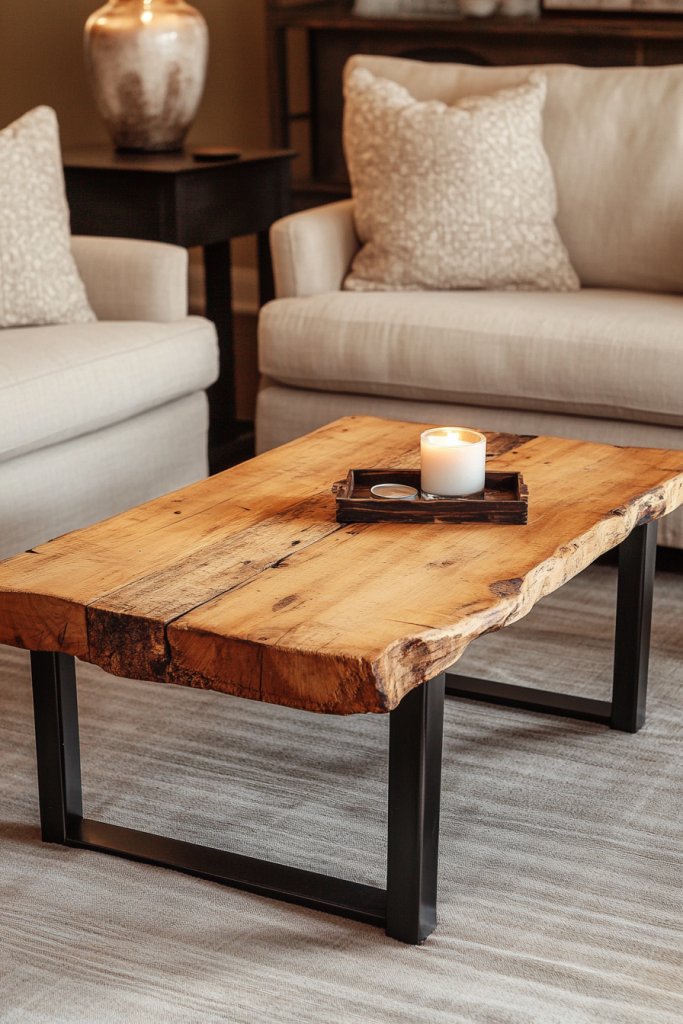 You can customize the finish by lightly sanding and sealing the wood to highlight its natural imperfections. For a more industrial look, choose metal legs with rivet details or a distressed finish. If space is tight, opt for a smaller, square design; for larger rooms, go for a chunky, rectangular table. During winter, add cozy textiles nearby; in summer, keep it clutter-free for a breezy feel. It’s adaptable for any aesthetic.