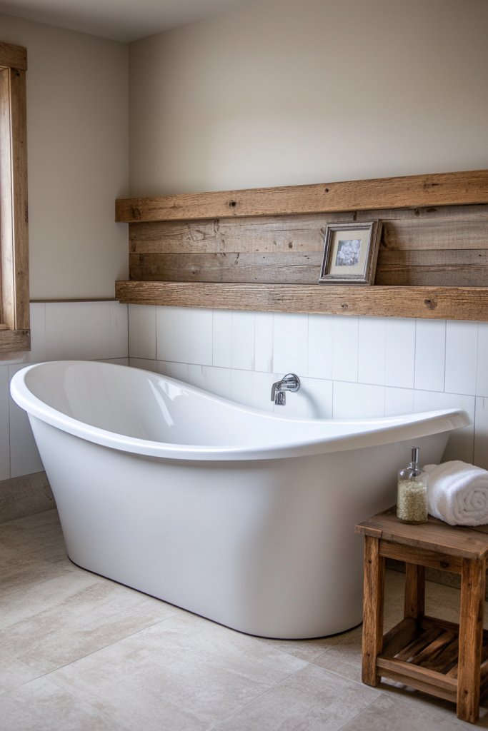 Imagine a deep, clawfoot bathtub with a matte black or white exterior, set against a backdrop of reclaimed wood paneling. Wooden trays hold your essentials, and a vintage-inspired faucet completes the look. The room features natural stone or tile floors, with simple linen curtains and soft lighting. The combination of rustic textures and sleek fixtures creates a balanced, inviting atmosphere.