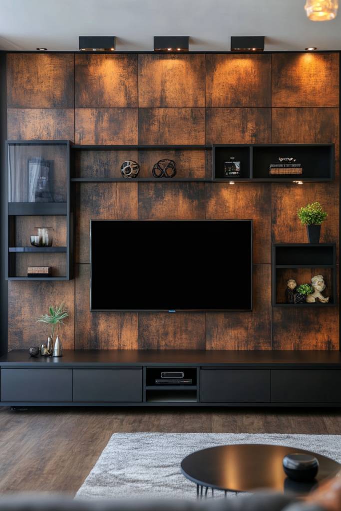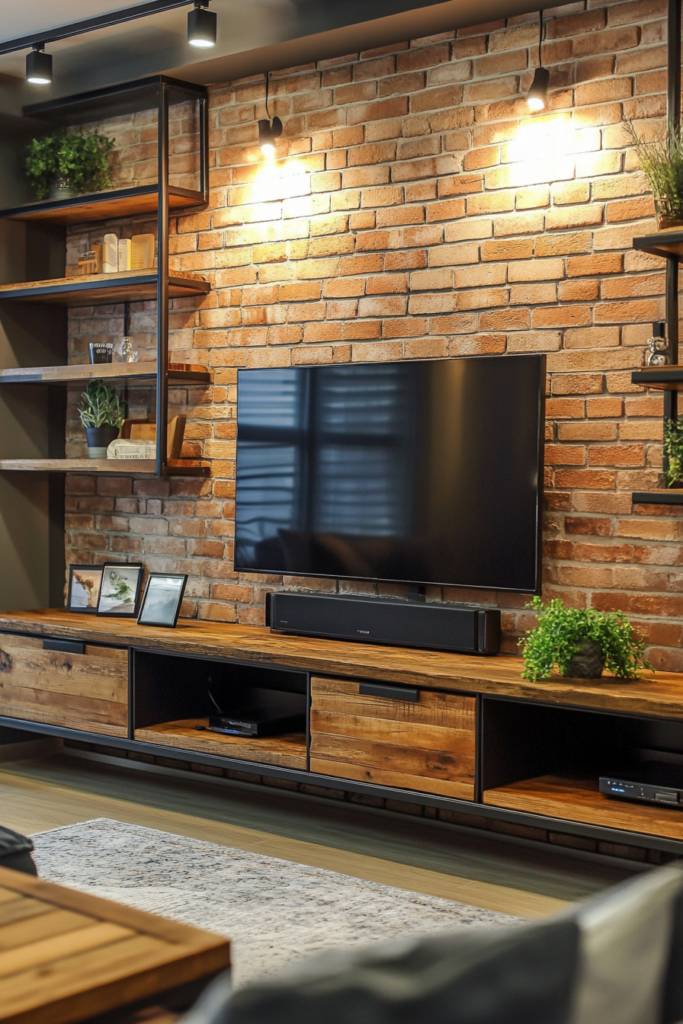 You can opt for an open shelving design where the wood shelves display your favorite decor pieces, while the metal brackets offer sturdy support. A TV mounted above a rugged wooden console with metal legs creates a striking focal point.