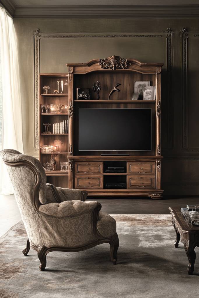 While embracing a vintage aesthetic, you can effortlessly incorporate modern functionality into your living space. Imagine a beautifully crafted wooden TV wall unit, reminiscent of mid-century designs, featuring intricate carvings and rich finishes. This classic look can seamlessly blend with your contemporary needs, offering ample storage while maintaining its charm.