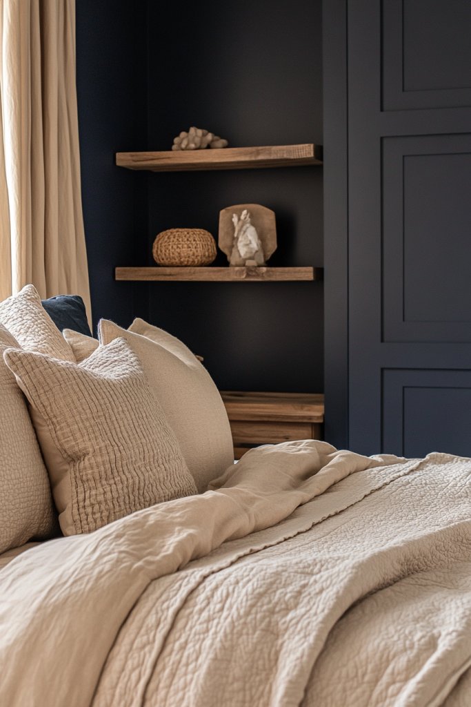 Navy paired with layered beige textures creates a classic, cozy bedroom that feels both elegant and approachable. It demonstrates how layering textiles and textures can transform a simple color scheme into a luxurious retreat. Your space can become the perfect haven for relaxation and style. Ready to build your layered sanctuary?