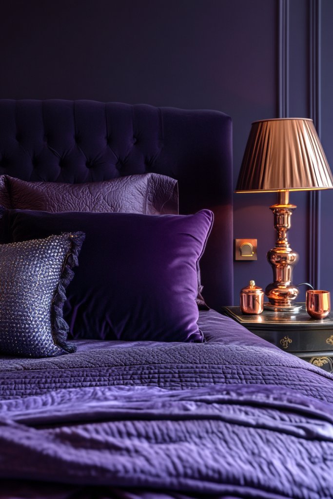 Visualize deep plum walls that seem to shimmer subtly under warm copper fixtures—like sconces, picture frames, or decorative hardware. Textured fabrics like velvet cushions or silk curtains in complementary shades add tactile richness. Layered lighting in warm tones highlights the richness of the colors and textures. A plush rug in neutral or metallic tones anchors the space, making it feel lush and inviting. The overall effect is a bedroom that feels both regal and cozy.