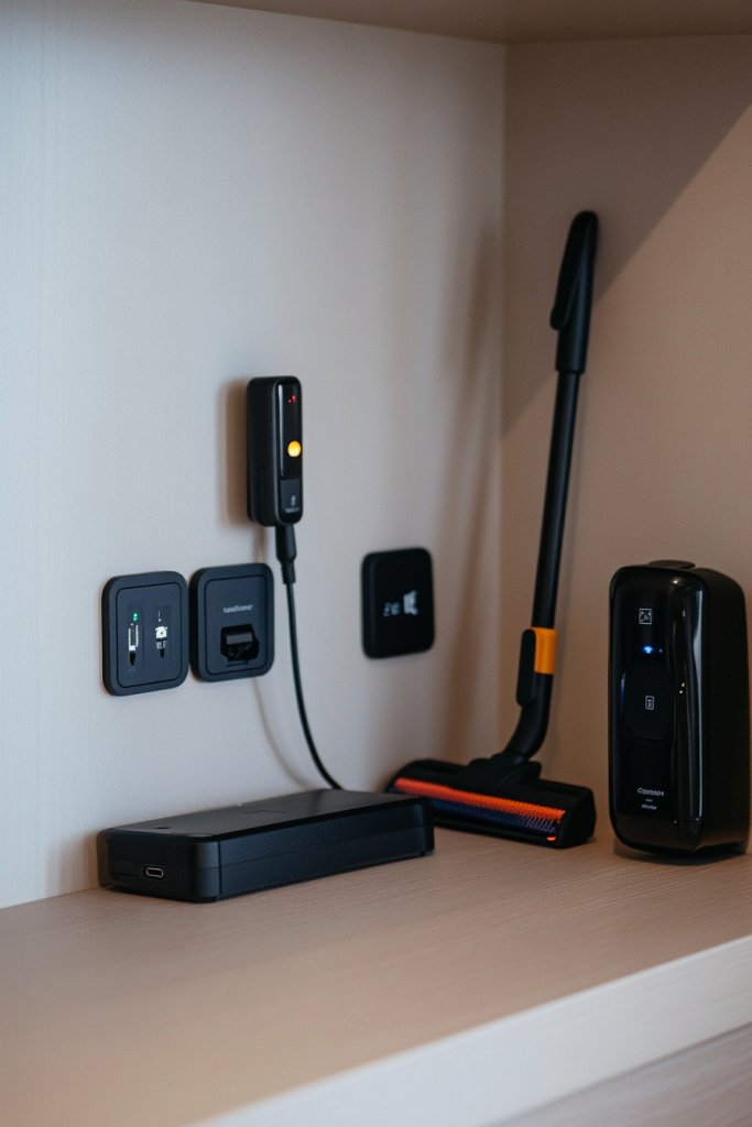 Picture a slim wall-mounted panel or small dedicated cabinet with multiple outlets and cable management features. The station holds your cordless vacuum, smart device chargers, and even small batteries, all plugged in and ready. Cables are neatly tucked away with clips or channels, keeping the surface clean. It’s a sleek, functional addition that makes charging effortless and organized.