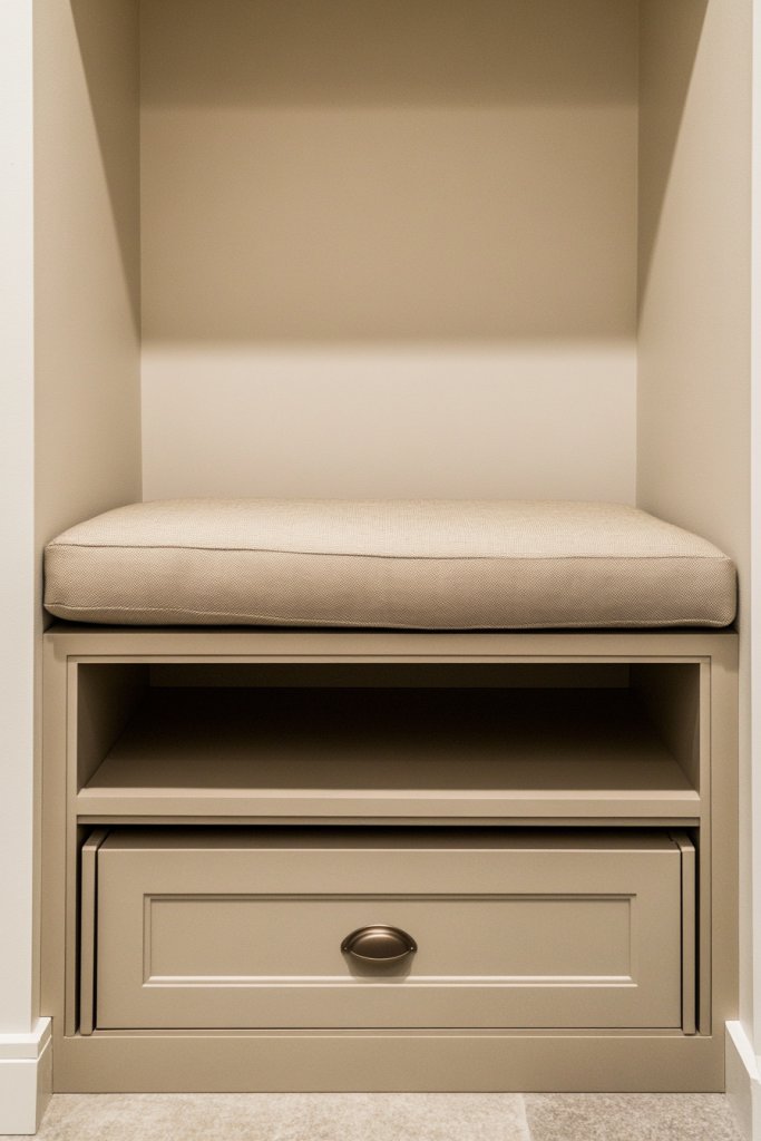 Picture a sturdy, upholstered bench placed against the wall, topped with a soft, textured throw. Beneath the seat, drawers or cubbies hide shoes, cleaning supplies, or seasonal gear. The bench’s fabric complements the room’s color palette, adding warmth and softness. Its compact size makes it perfect for tight spaces, while the hidden compartments keep clutter out of sight. It’s both practical and charming.