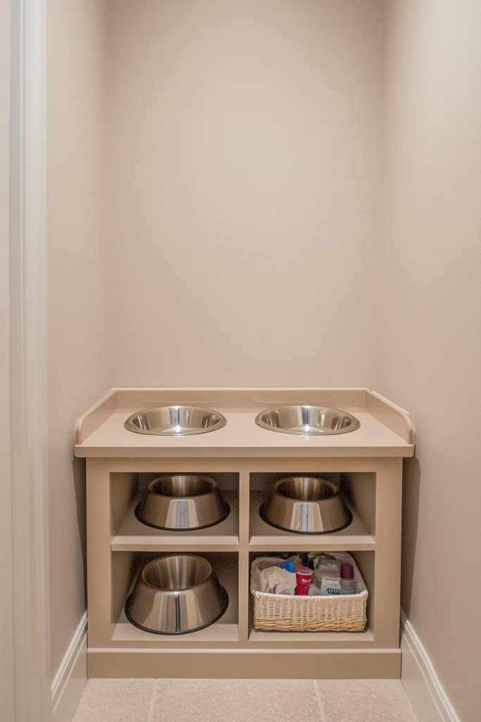 Visualize a cozy corner with a water-resistant feeding station—bowls on a raised platform or a small nook with hooks for leashes and collars. Nearby, a cabinet or cubby holds supplies like treats, toys, and grooming tools. A small wash station or tub makes cleaning pets quick and easy. The setup is charming, practical, and keeps pet essentials in one place.